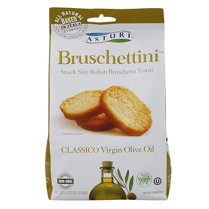 Discover the perfect complement for your homemade bruschetta with Asturi Bruschettini, Classico Virgin Olive Oil. These Italian-crafted toasts add a crunchy, flavorful base that enhances the taste of your favorite toppings.