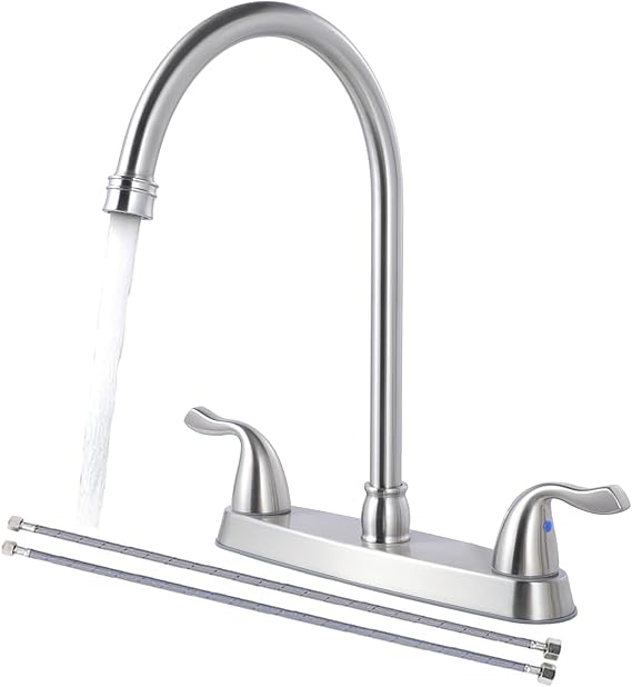 The SHACO 2 Handle Kitchen Faucet features a robust stainless steel construction with a brushed nickel finish that resists scratches and stains, reducing maintenance needs over time. Its 360-degree high arc swivel spout offers exceptional flexibility, allowing you to easily access every corner of your sink for cleaning and filling large pots. The dual handles provide precise temperature control, enabling you to set hot and cold water separately with ease.