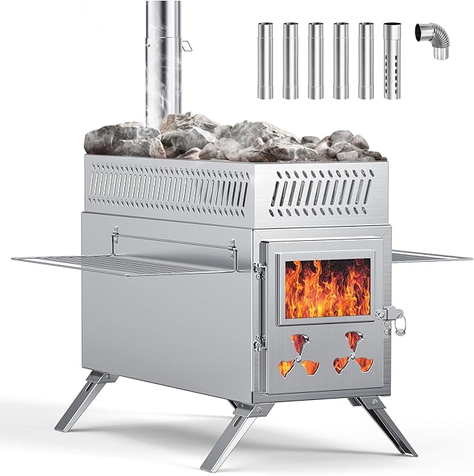 Crafted to serve as a 2-in-1 stove and tent heater, this model excels in providing efficient heat while doubling as a cooking station. You can use it inside canvas tents, yurts, cabins, or patios for heating, boiling water, and even preparing meals. Adding the included rock box (volcanic rocks not included) converts it into a steam sauna, perfect for relaxing muscles after outdoor adventures.