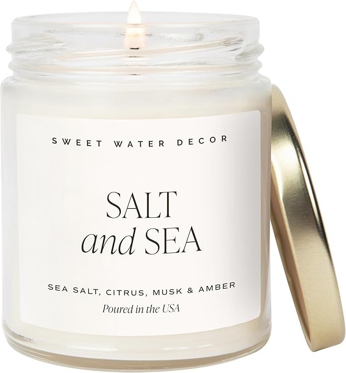 The Sweet Water Decor Salt and Sea Candle boasts a sleek 9oz clear jar with a gold lid, blending style and functionality. Its fragrant blend of sea salt, citrus, musk, and amber delivers a sophisticated, spa-like experience.