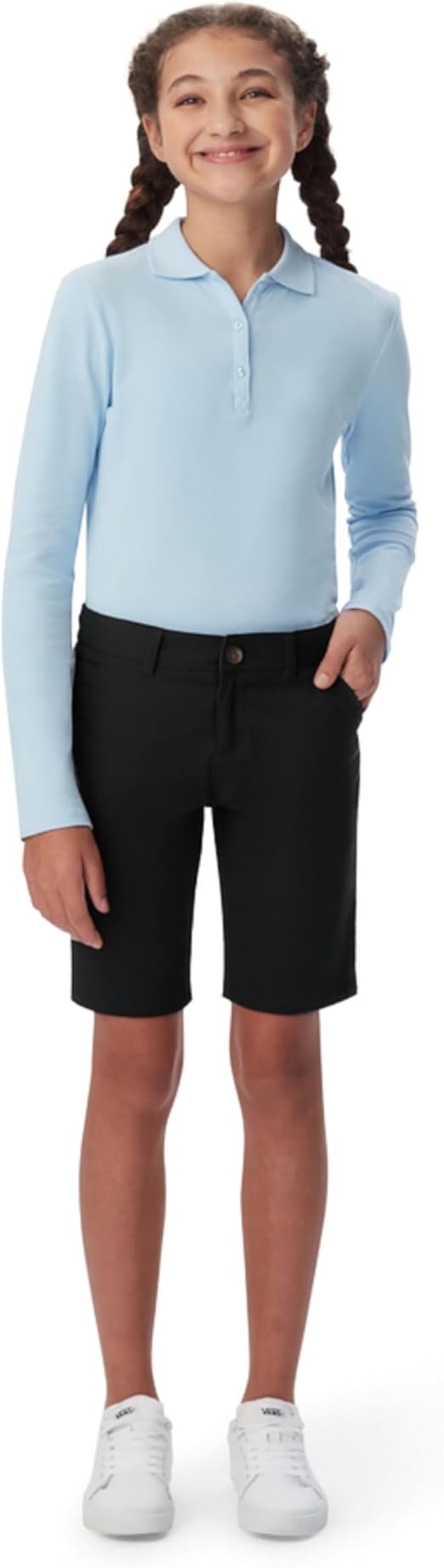 The well-made materials and thoughtful design combine durability with stylish appeal. Additionally, the flat front style enhances a clean look that remains neat throughout the day. These shorts deliver great value, blending practicality with a modern aesthetic for active, stylish girls.