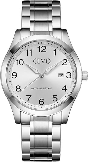 12. CIVO Silver Analog Watches for Men: Waterproof Quartz Stainless Steel