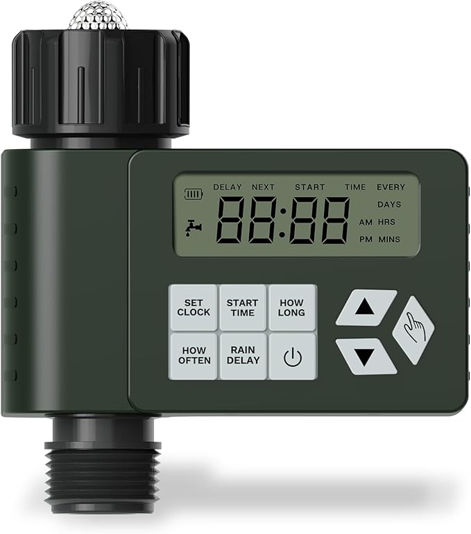 The timer maintains its schedule even when the batteries are replaced, ensuring consistent watering. Its rain delay function allows you to pause watering for 24, 48, or 72 hours, preventing overwatering during rainy periods. Built with sturdy, water-resistant materials, it withstands weather conditions and provides reliable performance over time.